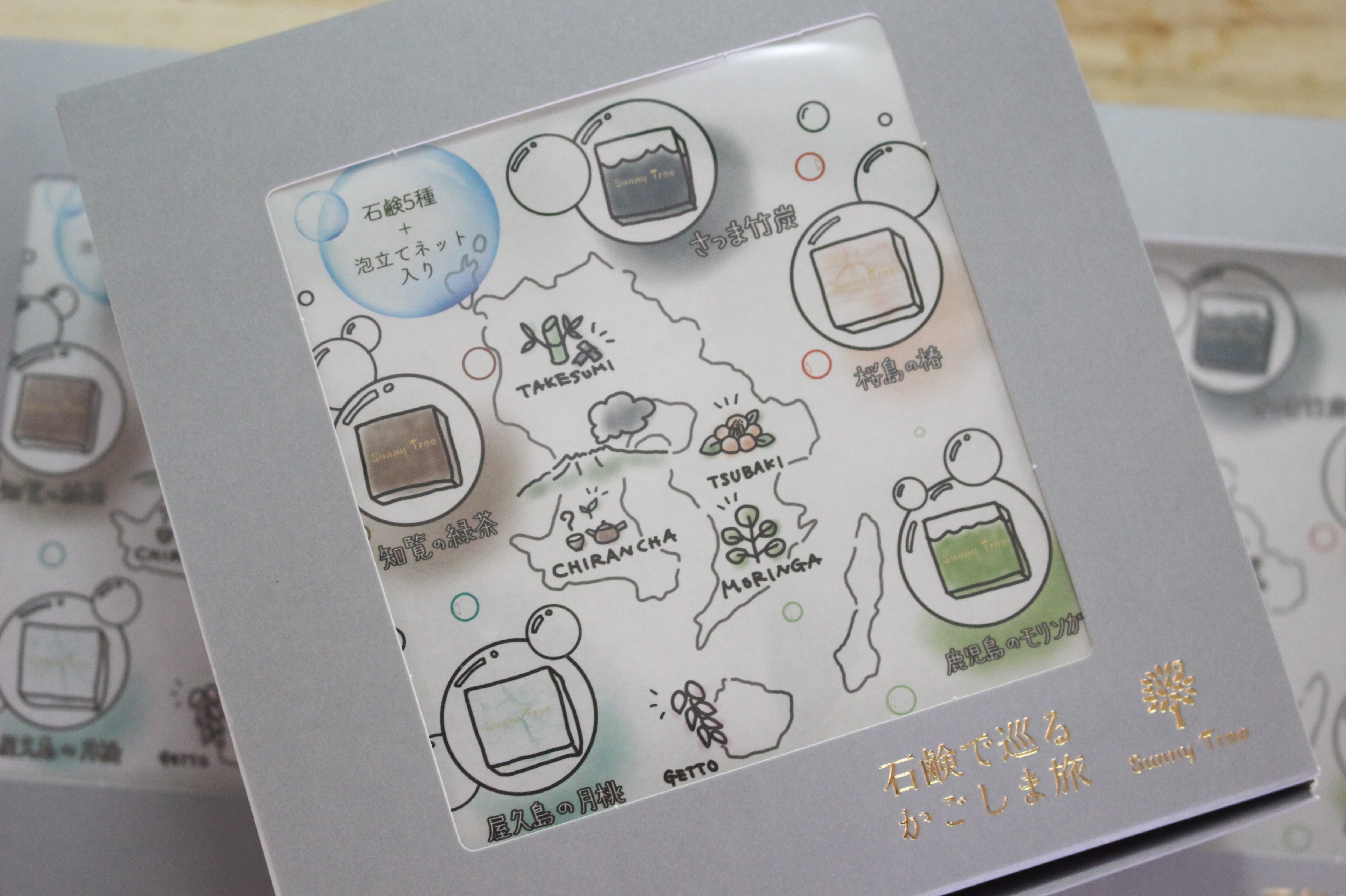かごしまシリーズの石けん5種類と、SunnyTreeオリジナル泡立てネットをセットにした、少しお得なセットです。